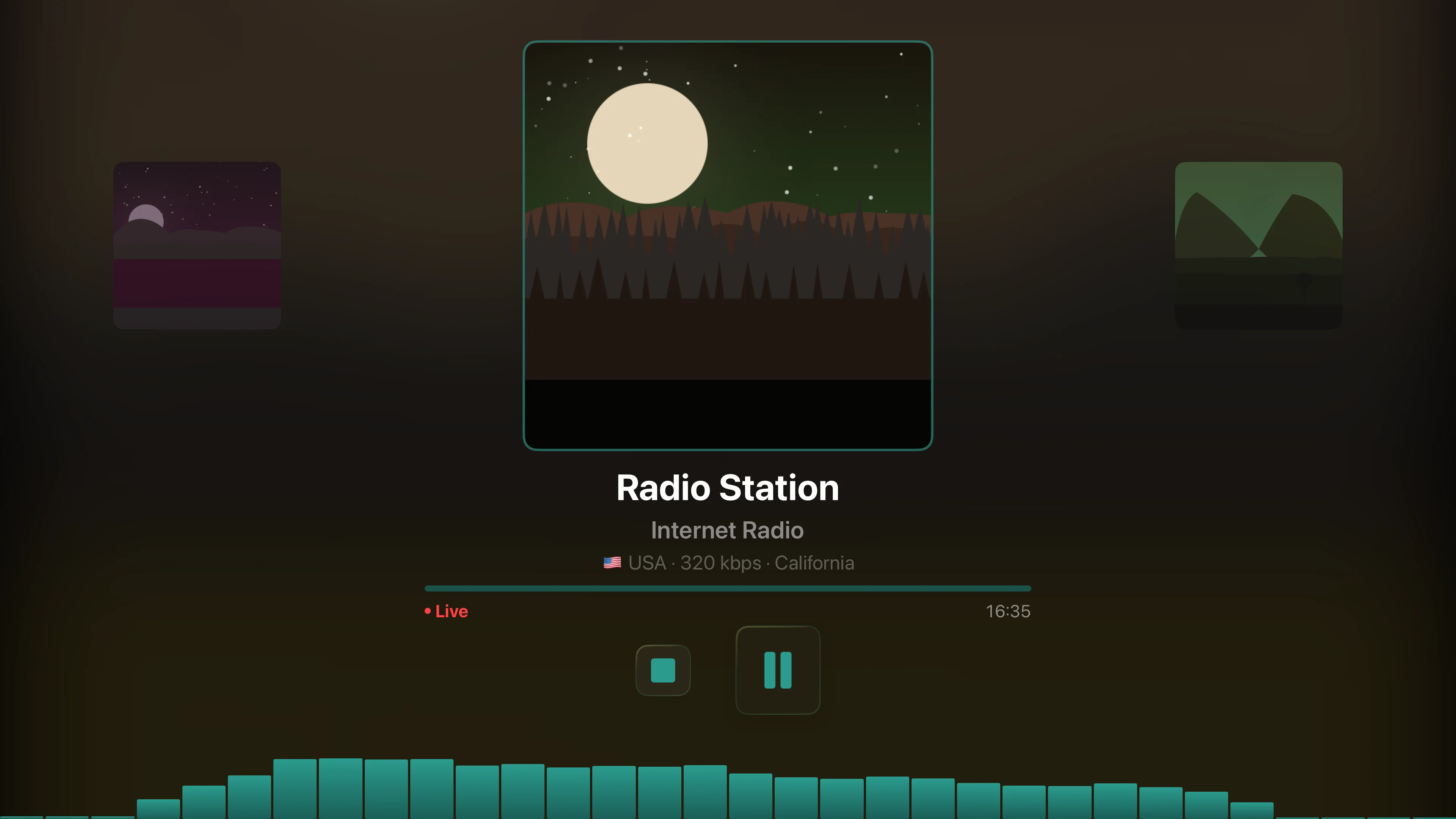 The Now Playing experience isn't an afterthought just because there's no queue. Every station gets its moment: high-res artwork front and centre, tasteful controls that land under your thumb, and ambient glows that pull the colour from whatever's on the air.