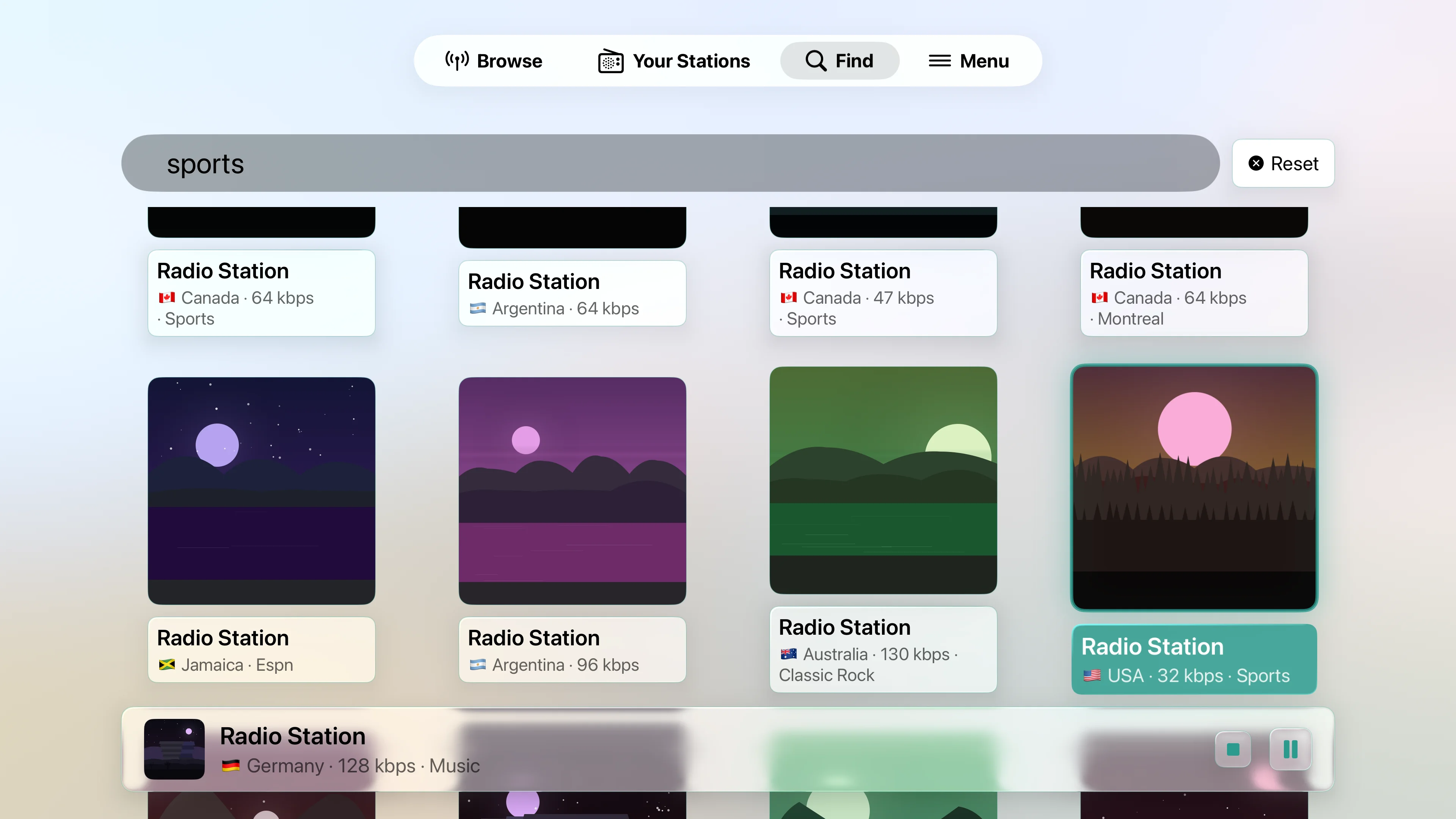 Apple Watch on your wrist. CarPlay on the road. iPad on the couch. MacBook at the cafe. Apple TV in the living room. The same Station Browser and saved favourites, handcrafted for each screen.
