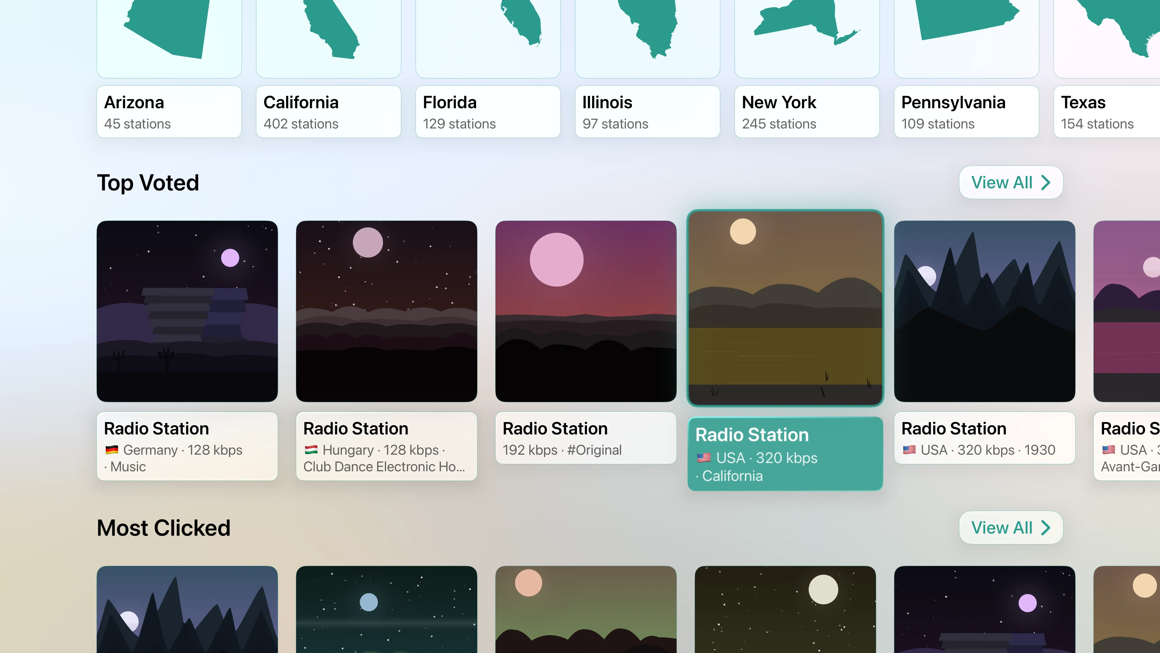 Radio Browser's community-curated directory is built in. No sign-up, no key to paste, nothing to dismiss. Top Voted and Most Clicked are the first thing you see, so there's always somewhere to drop in when you don't know what you're in the mood for.
