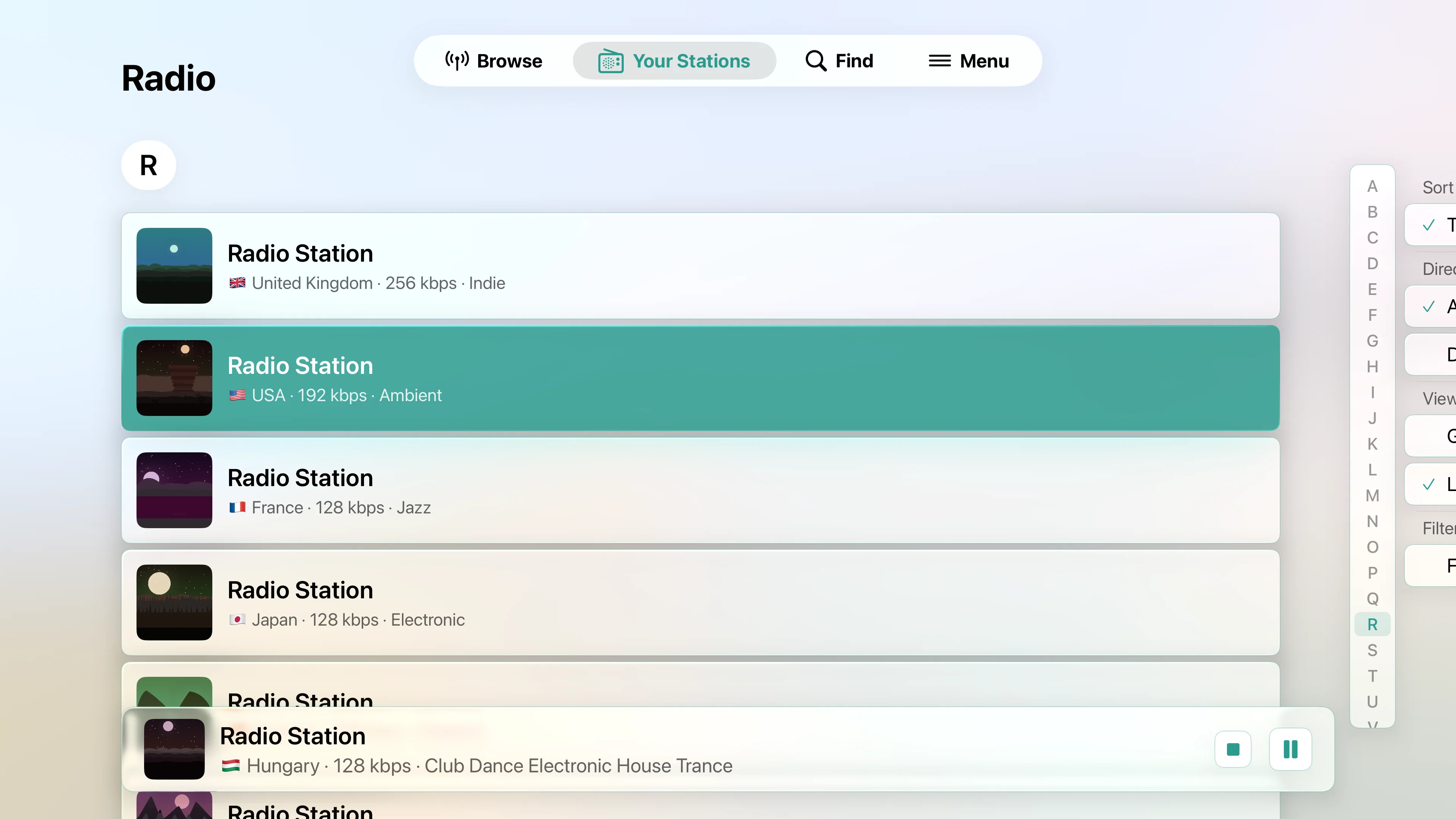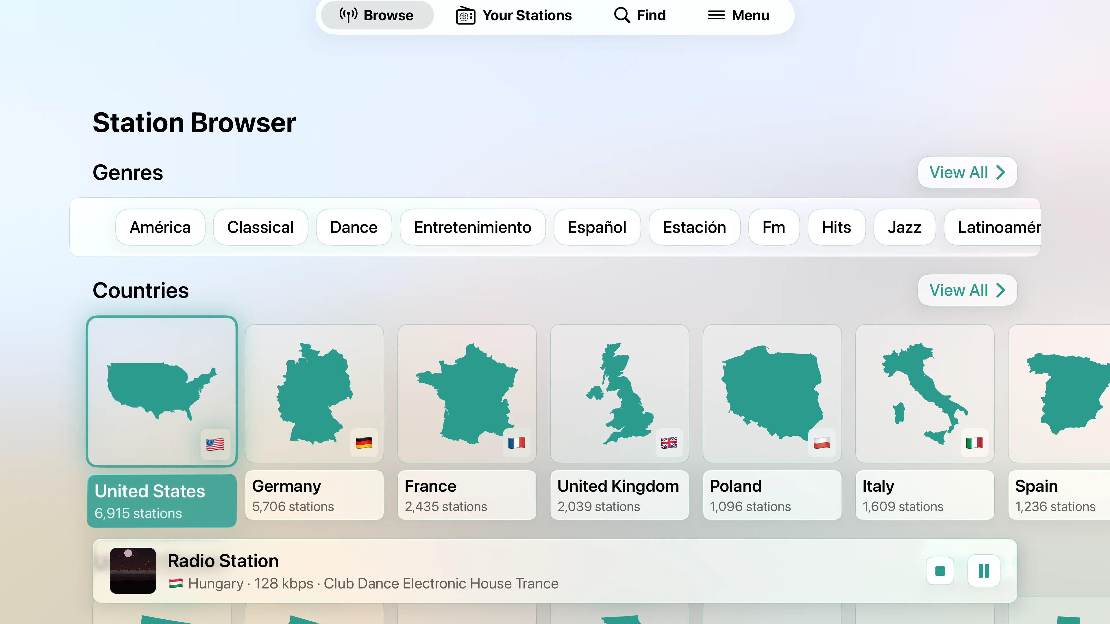 The Station Browser keeps trending picks, top-voted stations, and your saved favourites one tap away. Filter by country, U.S. state, genre, or audio codec. Drill into a list and back again β the navigation stack is per-tab, so the list you were just scrolling stays right where you left it.
