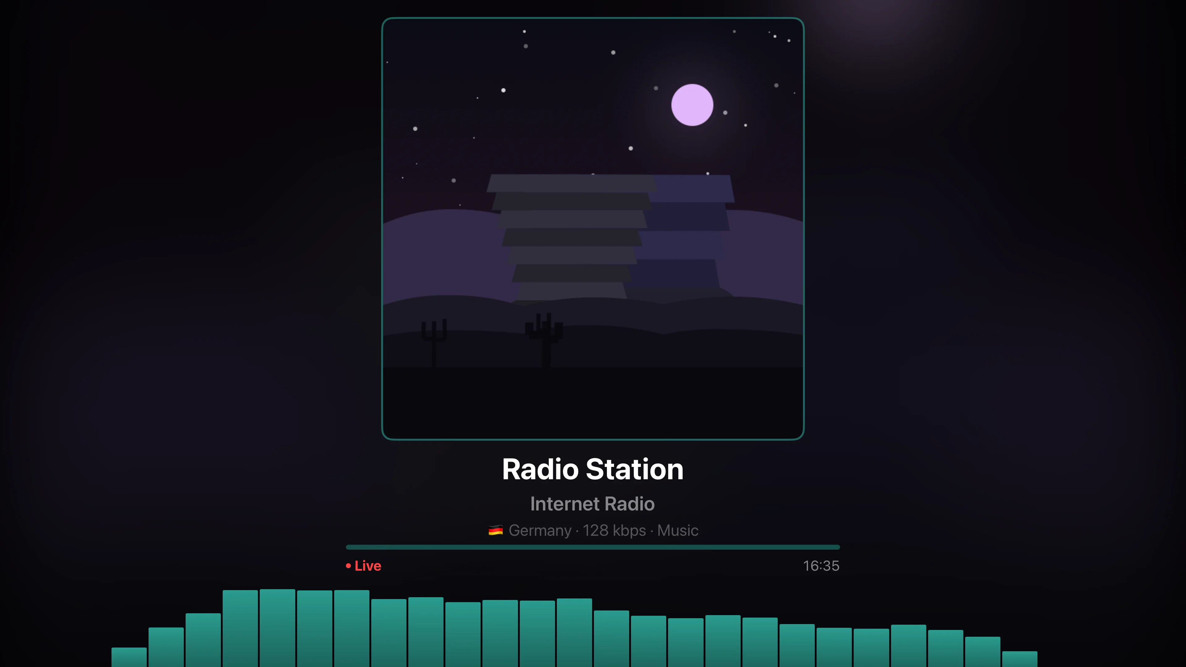 A player that sweats the small stuff. Crossfades between stations, fade-out on pause, a sleep timer that eases into quiet instead of cutting off, and a full 16-band EQ for tuning any station to your room.